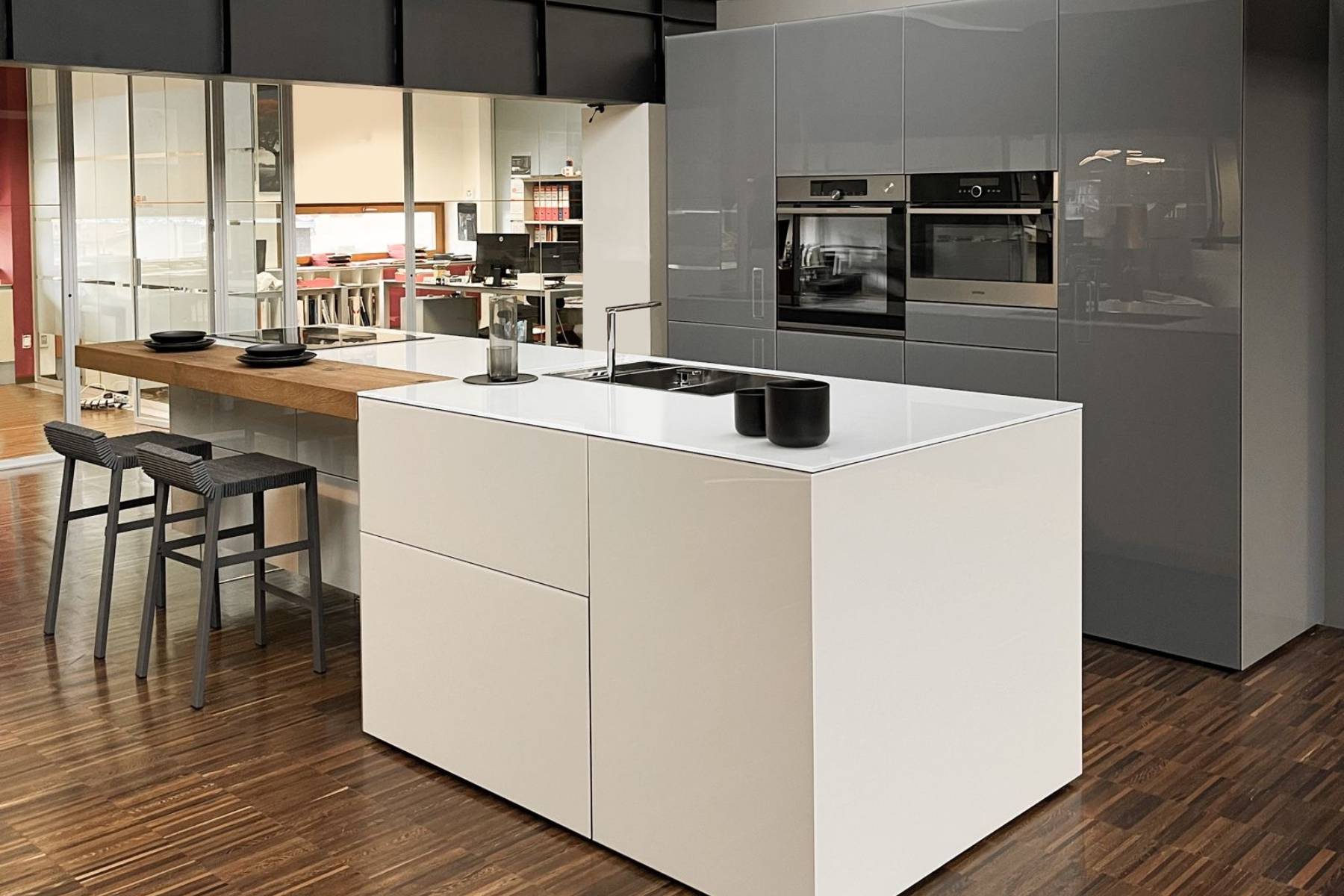 Colore in foto: Isola in vetro lucido colore Mandorla, piano snack in Wildwood Naturale, colonne in vetro lucido color Ferro e sostegni in vetro Lucido Extrachiaro