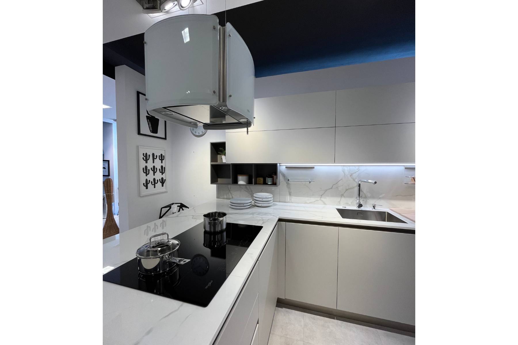 Oyster Pro decorativo di Veneta Cucine è una cucina con i frontali in Silk Grigio Tortora e il top è in Caranto Ker Calacatta lucido.