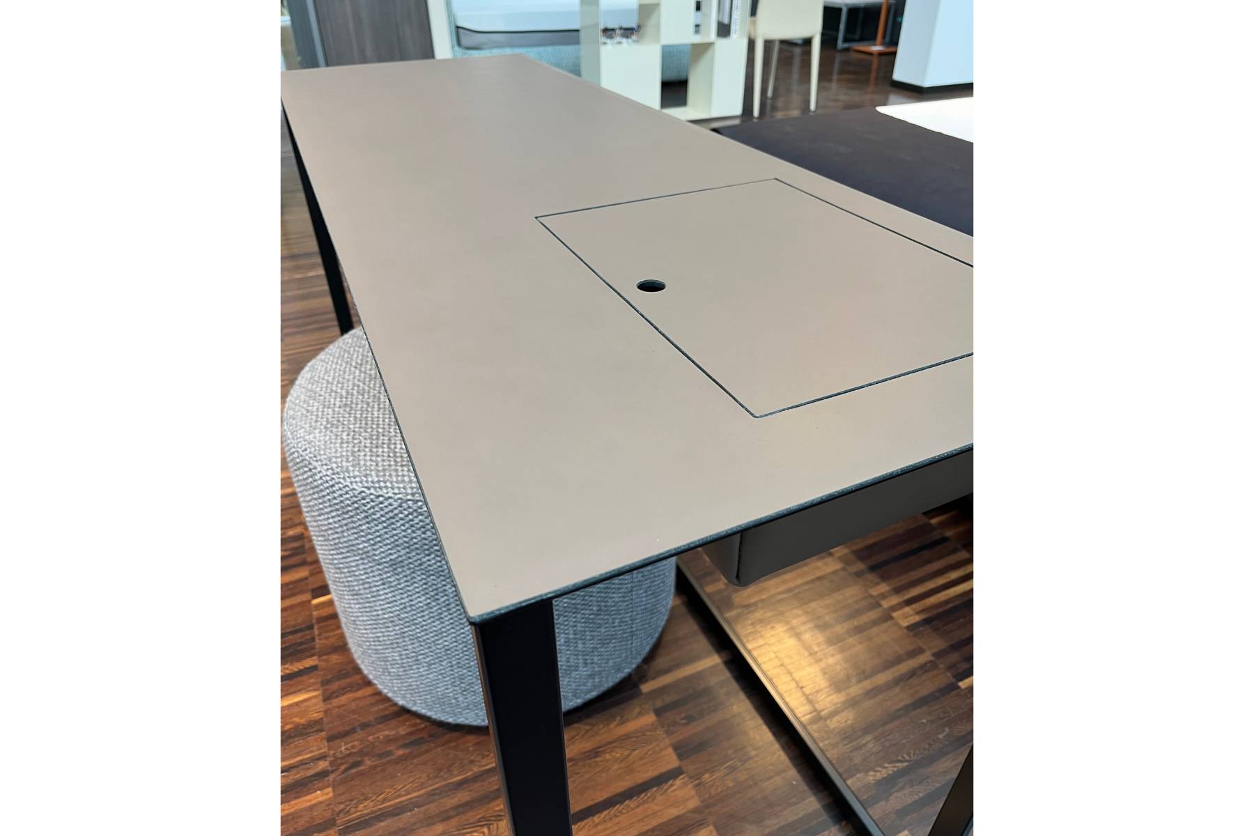 IlΒ vano portaoggetti rivestito in cuoio pigmentato Γ¨ accessibile tramite un’apertura a ribalta.