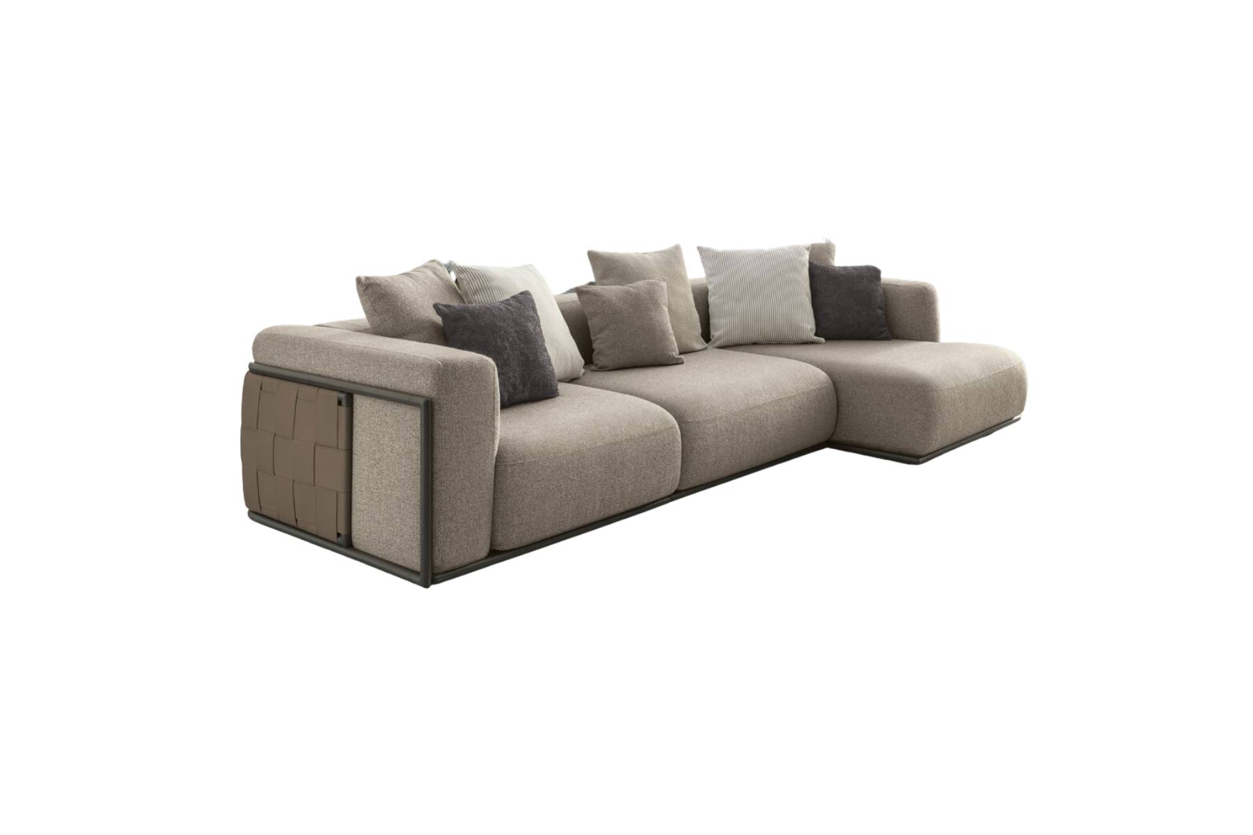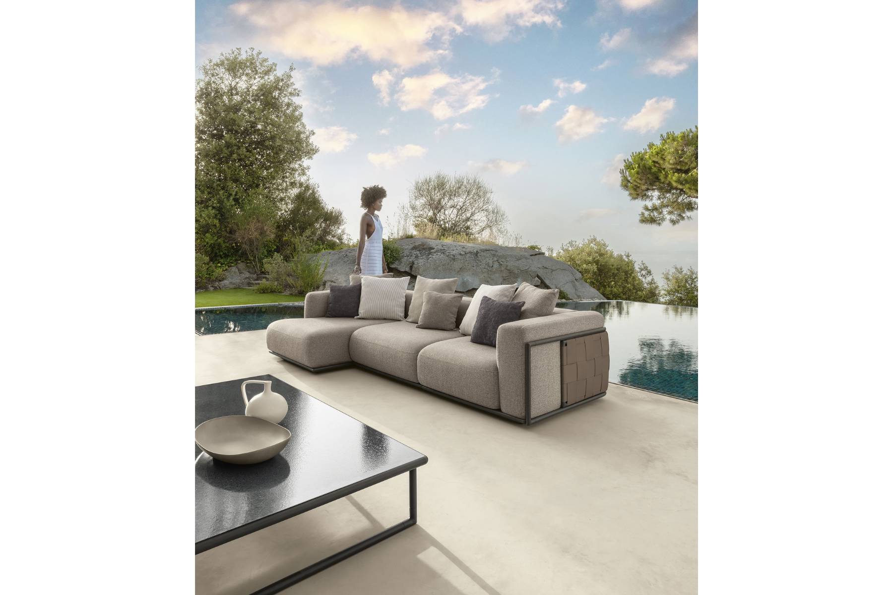 Tressé è un divano versatile e si adatta a qualsiasi ambiente esterno grazie a una vasta gamma di colori, dal grigio seta al fango intenso, fino al caldo terra di Siena. Confortevole e sofisticato, si distingue per gli schienali in alluminio tubolare rivestiti a mano con fasce intrecciate in ecopelle. Questo design raffinato aggiunge carattere agli spazi outdoor, combinando estetica e comodità.