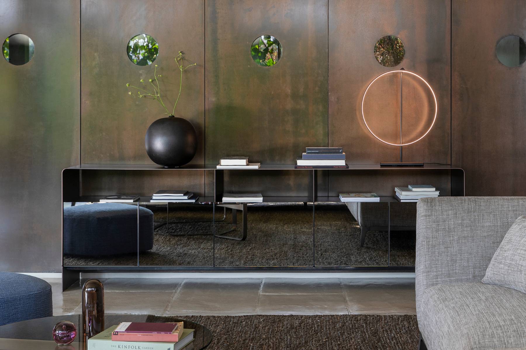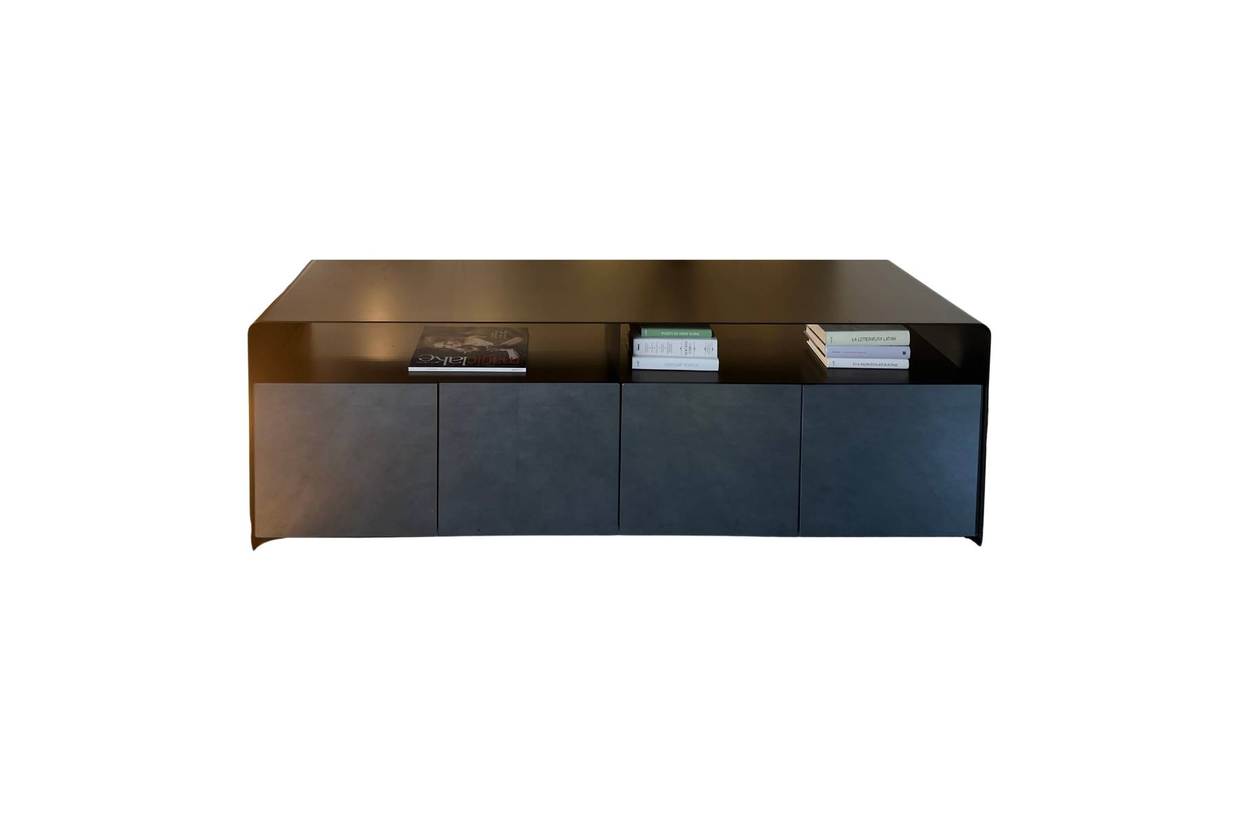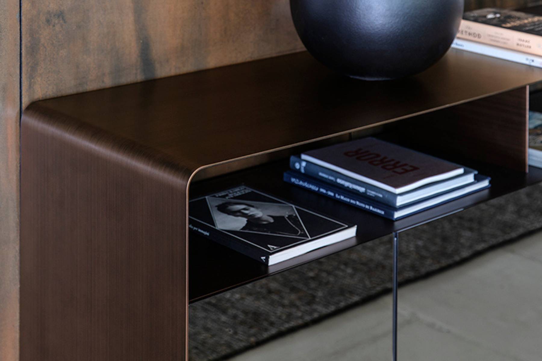 Madia Foglio di Flou Γ¨ parte della collezione Foglio. La sua struttura Γ¨ composta da una lastra di metallo curvato, che permette diverse configurazioni: madie di varie dimensioni, contenitori orizzontali o verticali con vani aperti o chiusi, e mensole. Le ante e gli schienali sono disponibili nello stesso materiale della struttura o in versione a specchio, nelle finiture fumΓ© e bronzato.