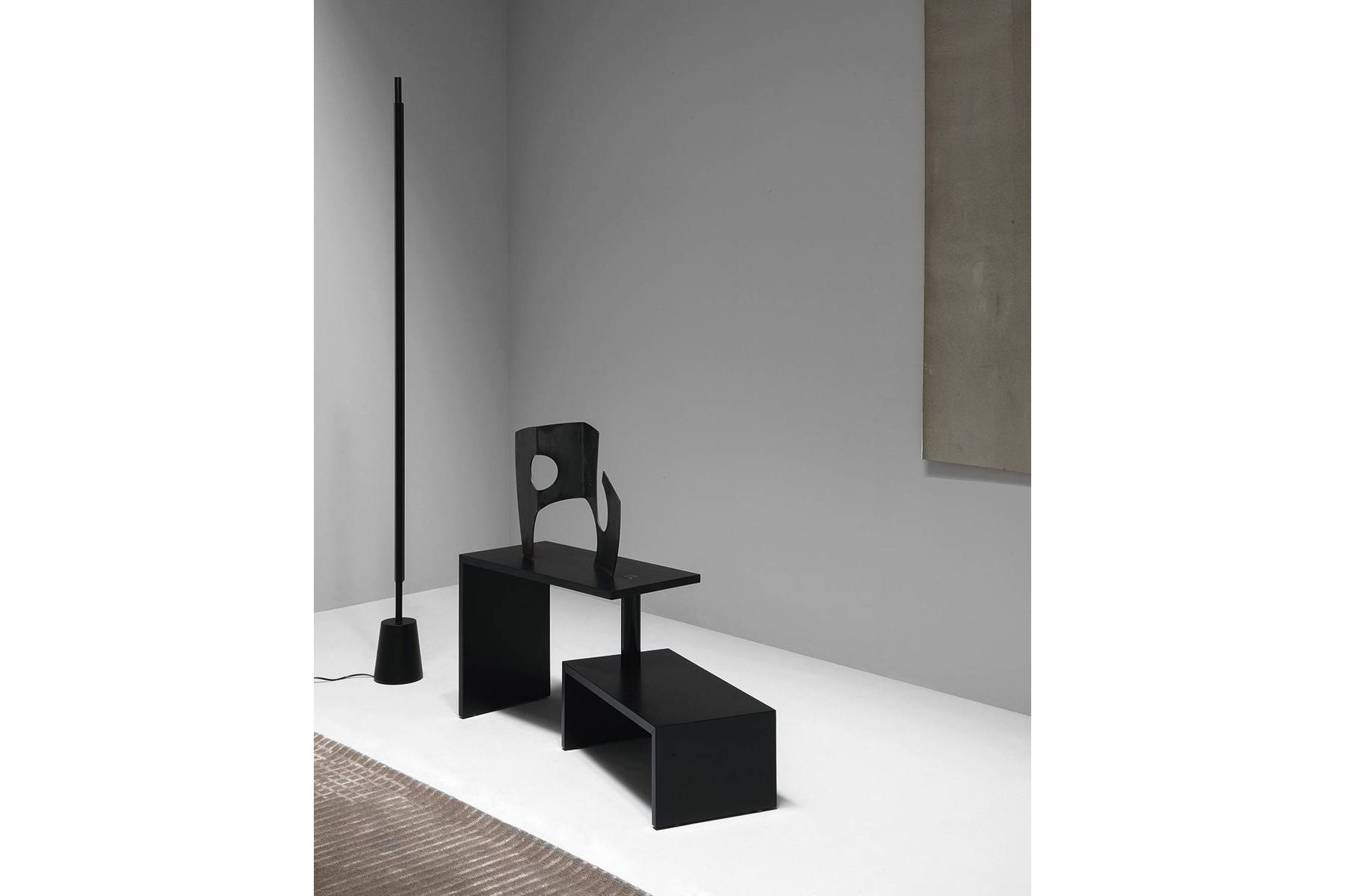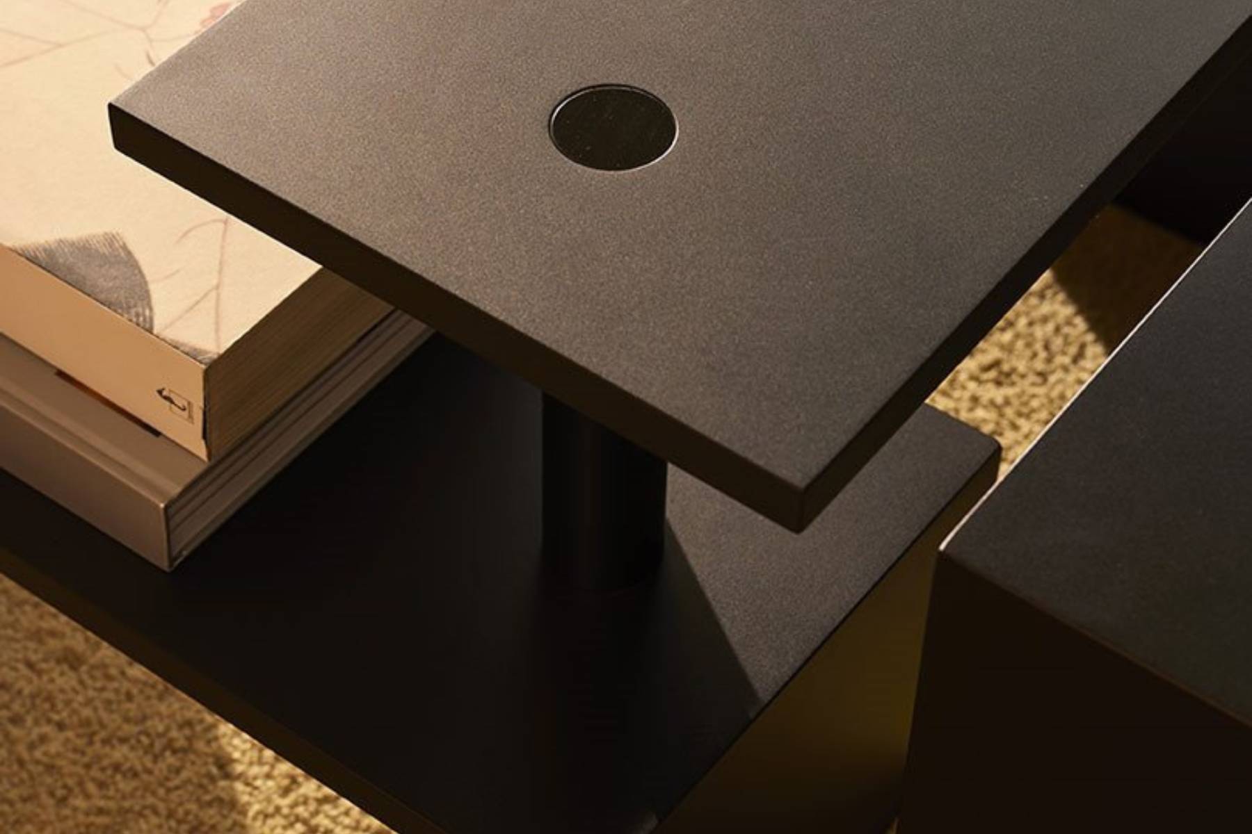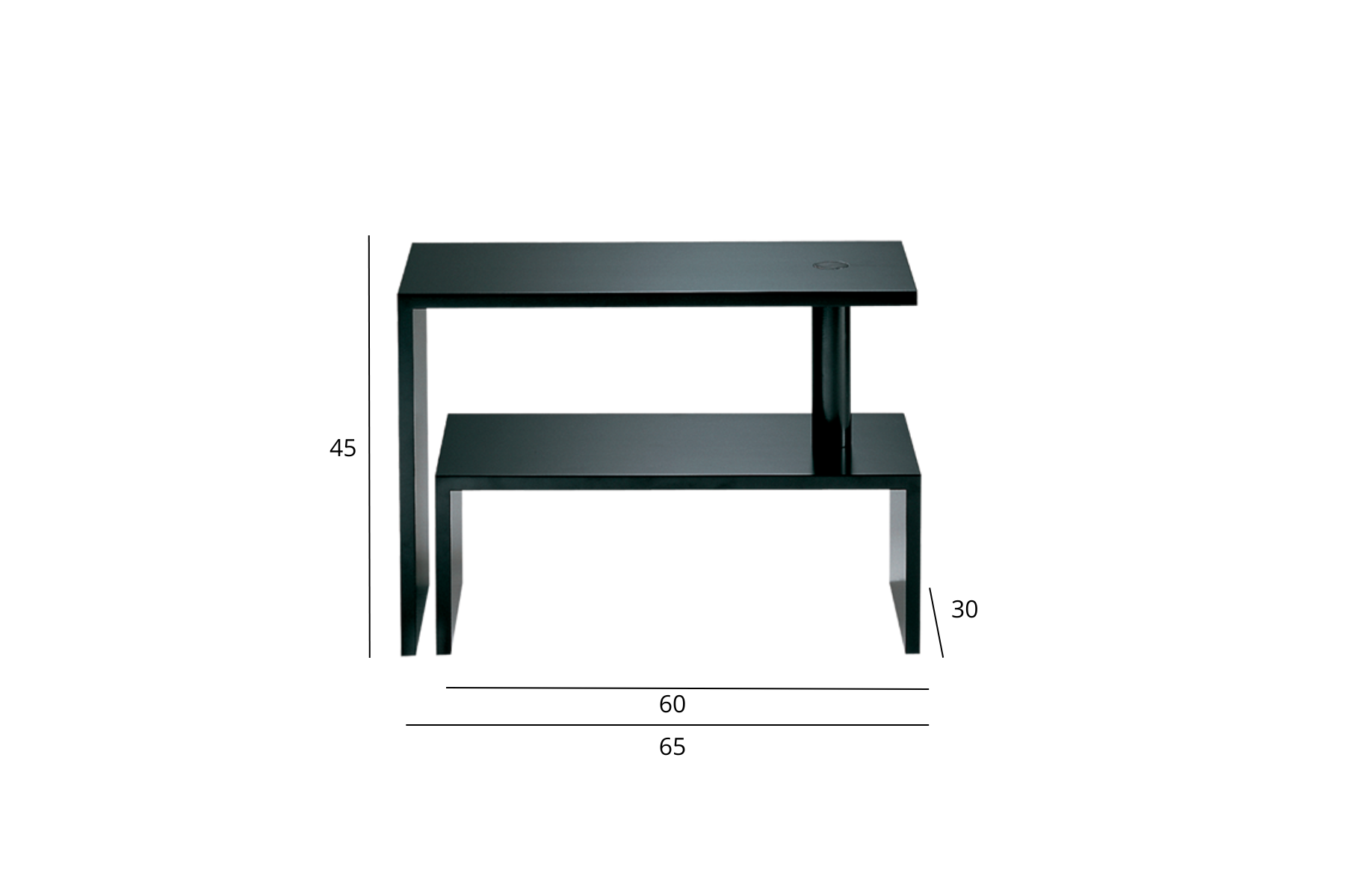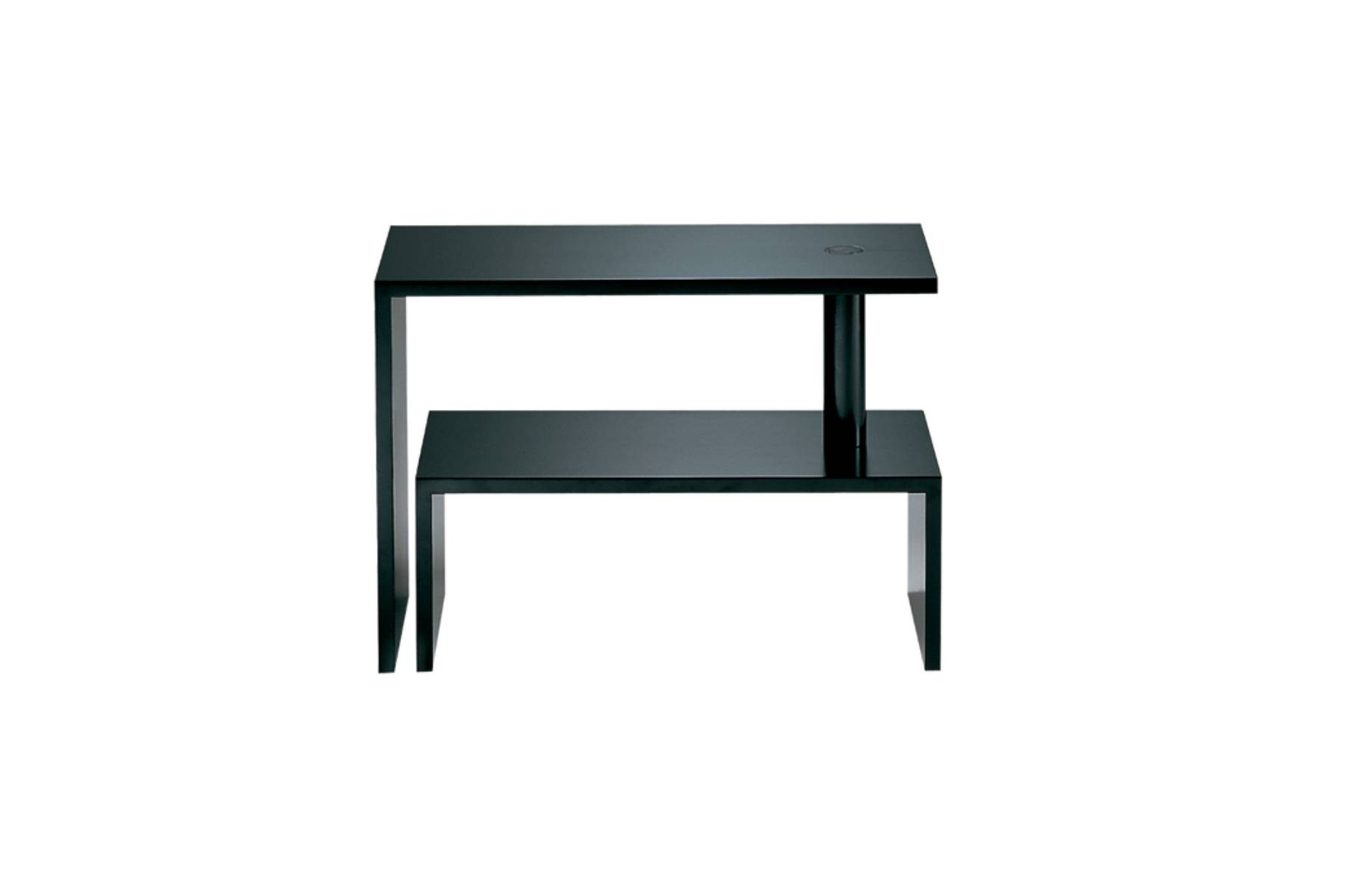 Basello di Zanotta Γ¨ un tavolinoΒ con doppio livello e ripiani girevoli. La struttura Γ¨ realizzata in fibra di legno a media densitΓ (MDF) con finitura verniciata goffrata antigraffio.