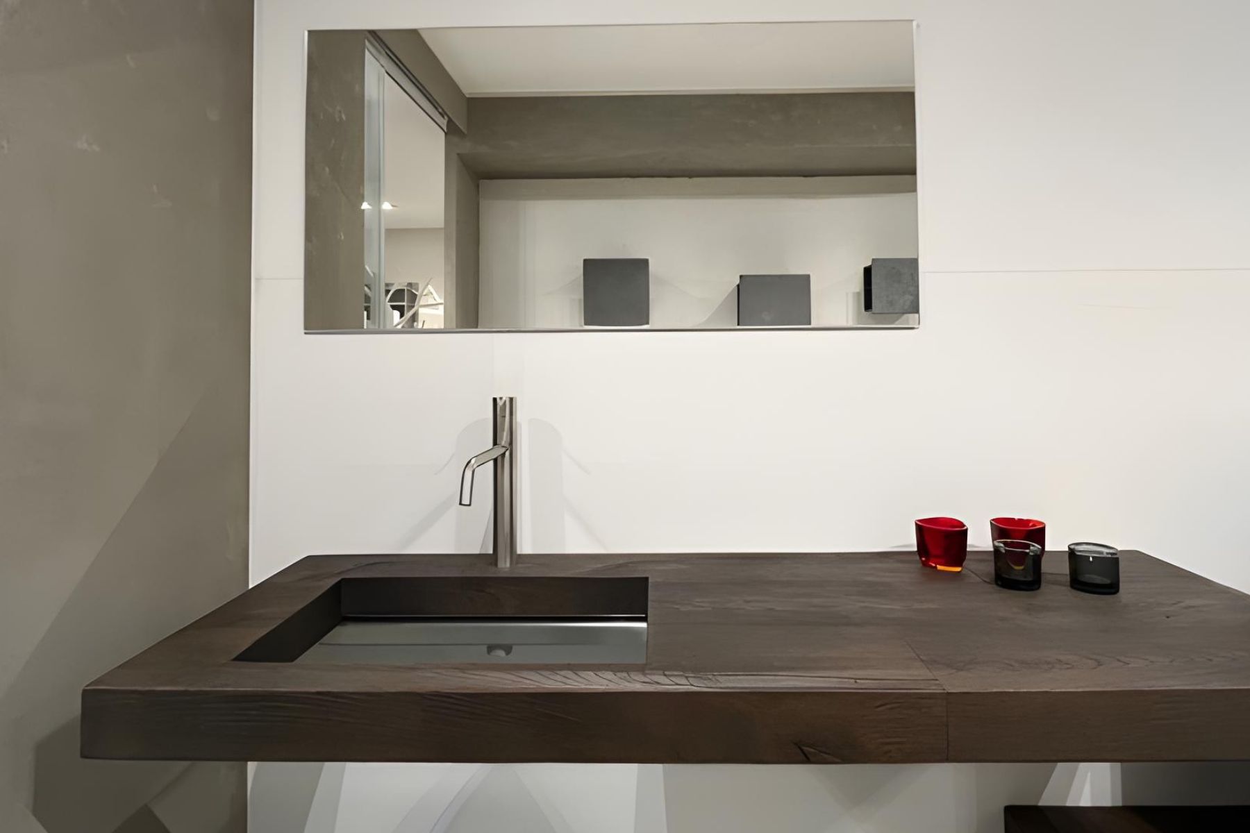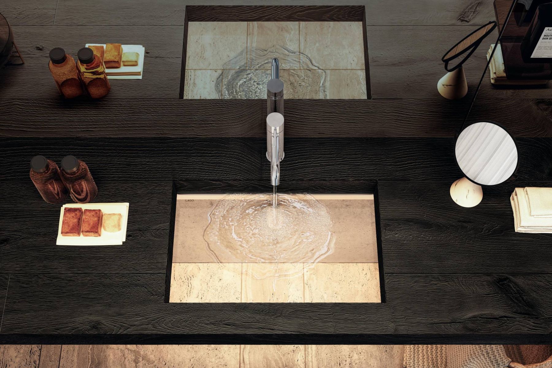 Mobile Bagno di Lago รจ composto da un piano il Wildwoodย lavorato termicamente che garantisce eleganza e resistenza ai liquidiIl e il lavabo Depth che combina leggerezza e profonditร  con un fondo in vetro inclinato, creando un effetto trasparente.