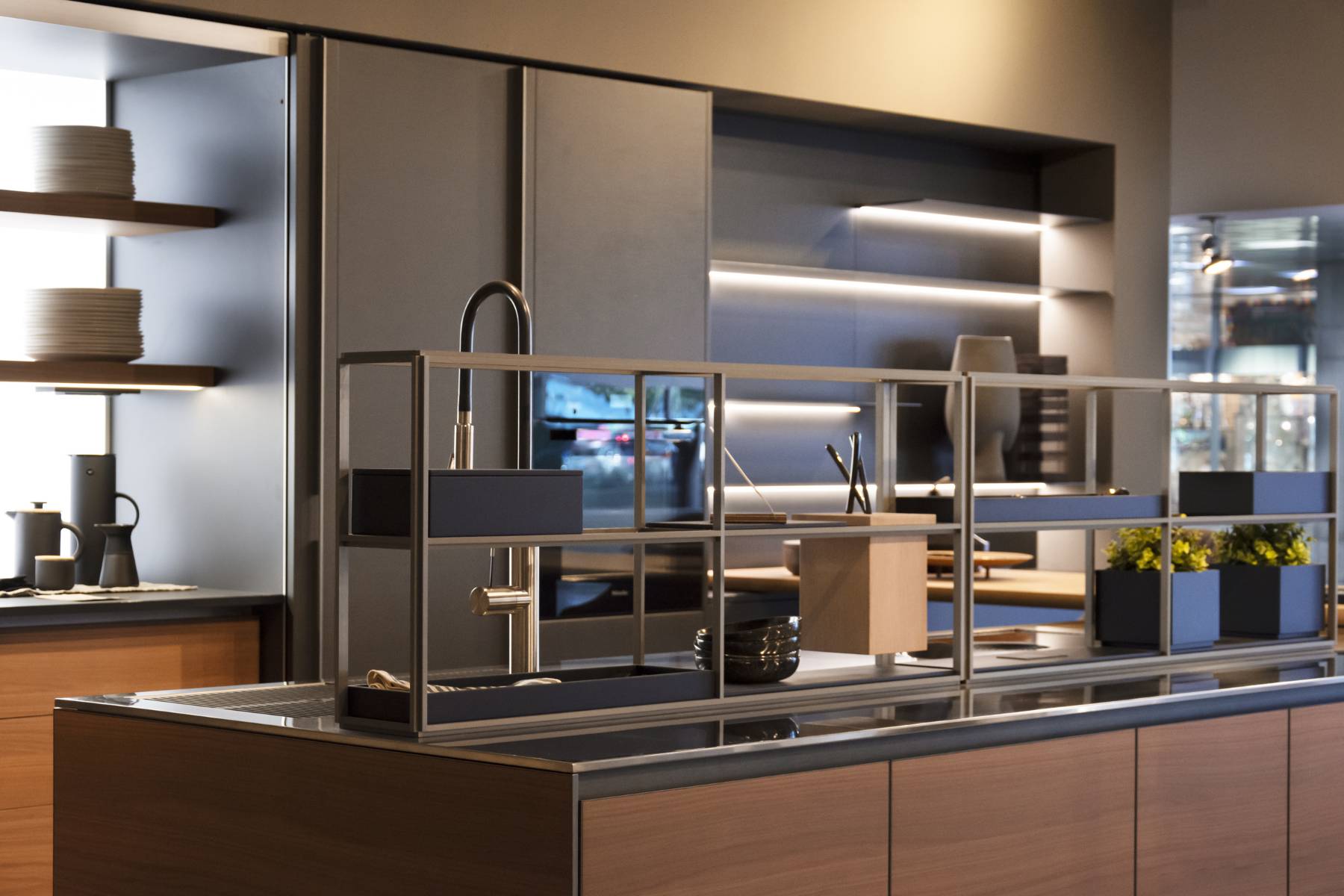 Le colonne sono in finitura Peltro, le basi in Noce, il top in acciaio Inox e il piano snack in Rovere massello