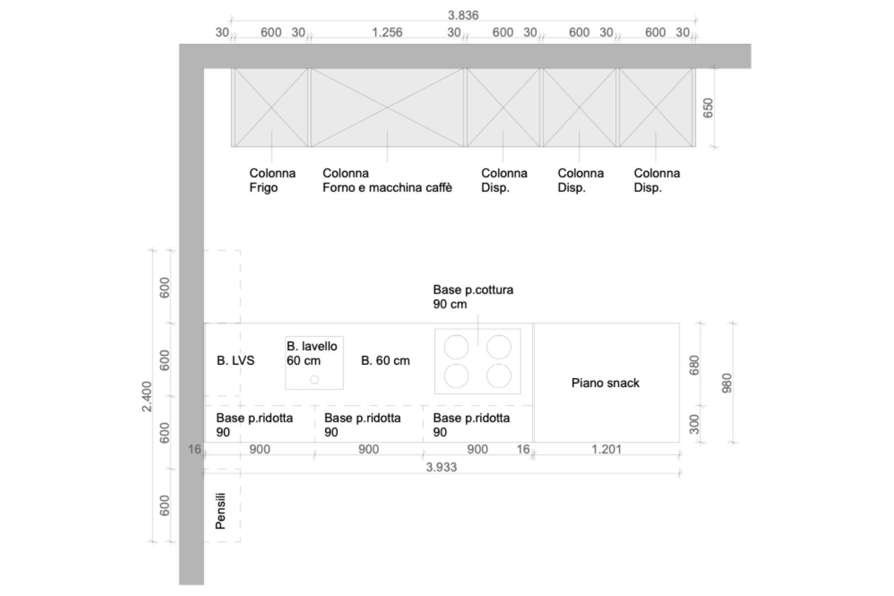 Un gioco che si svolge tra i sottili contorni dei fianchi e le linee piรน pronunciate e rette del piano di lavoro, interrotto dalla presenza massiccia dei lavelli in pietra.