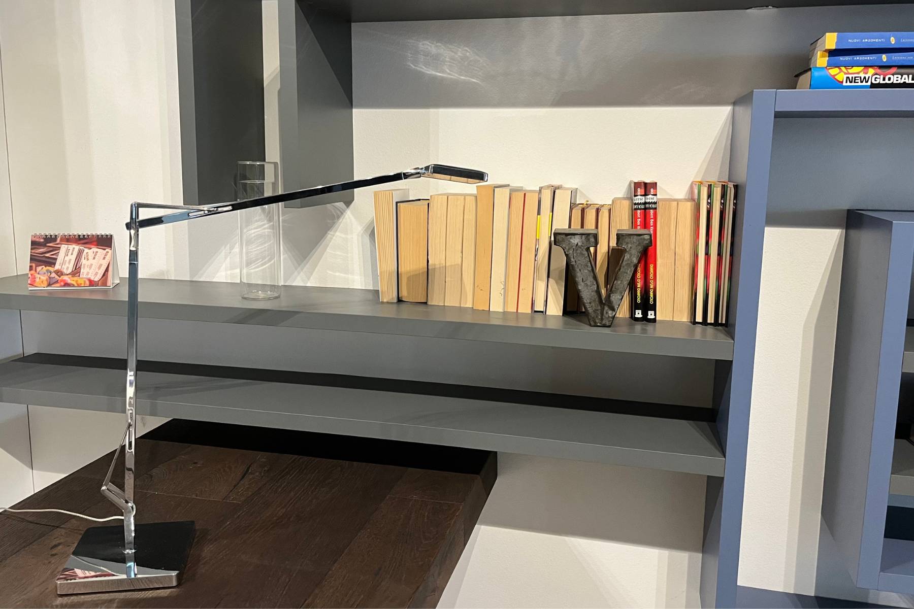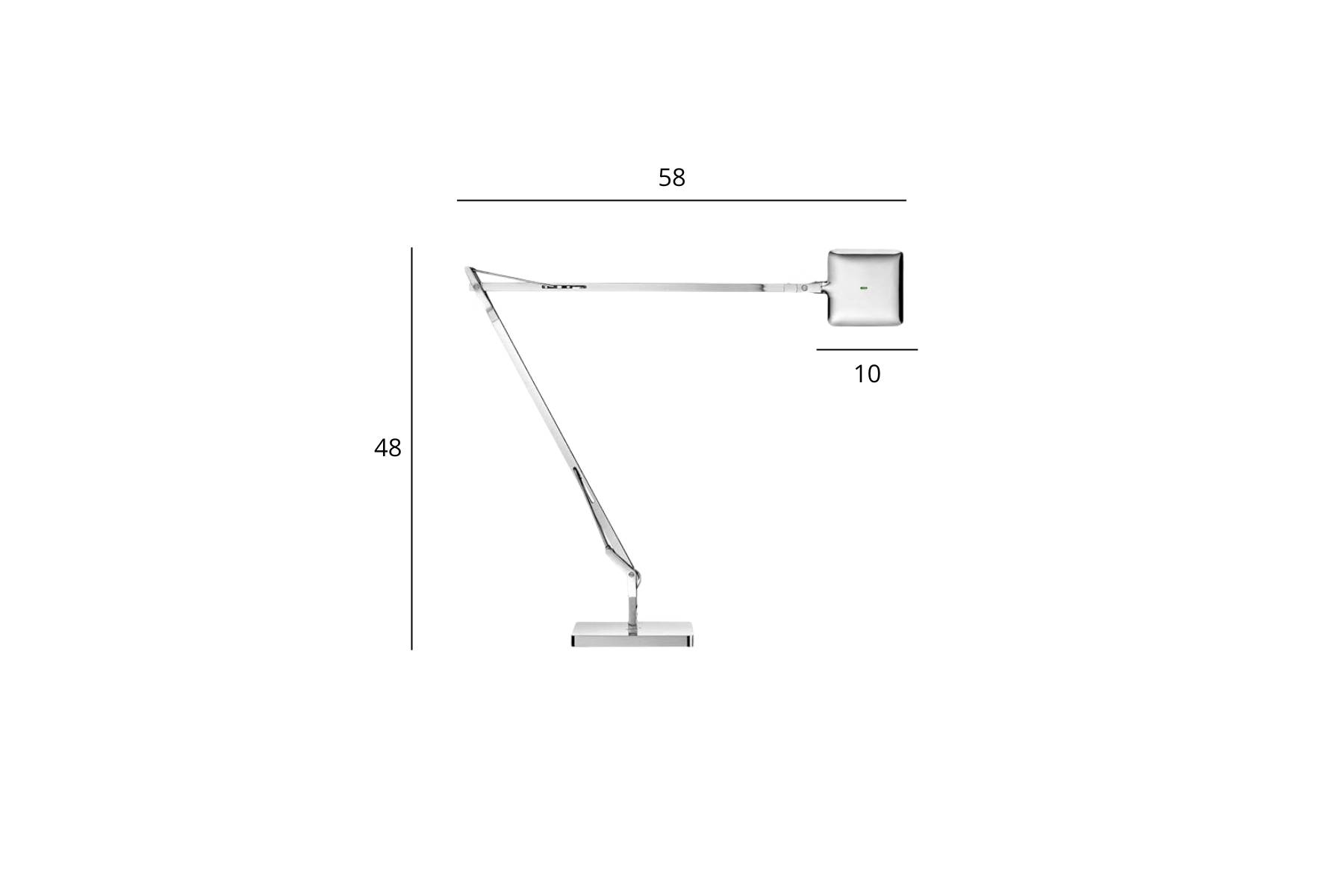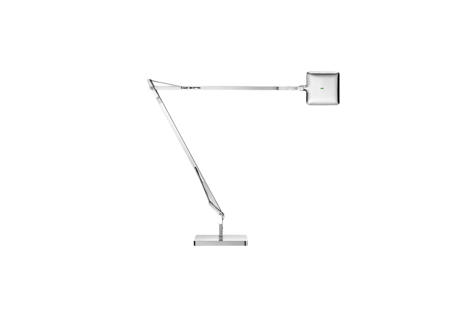 Kelvin di Flos รจ una lampada da tavoloย con luce diretta, caratterizzata da un doppio braccio a pantografo e testa orientabile. La struttura รจ ottenuta da un tubolare quadrato in lega di alluminio estruso lavorato meccanicamente per ospitare e consentire lo scorrimento delle molle di compensazione in acciaio inox.