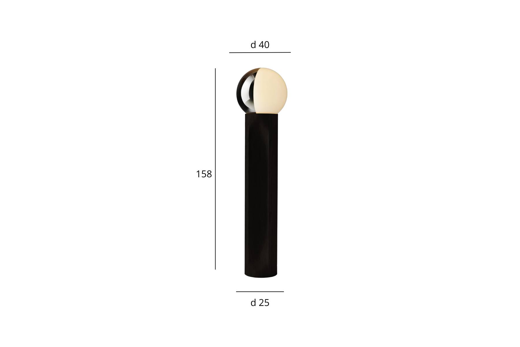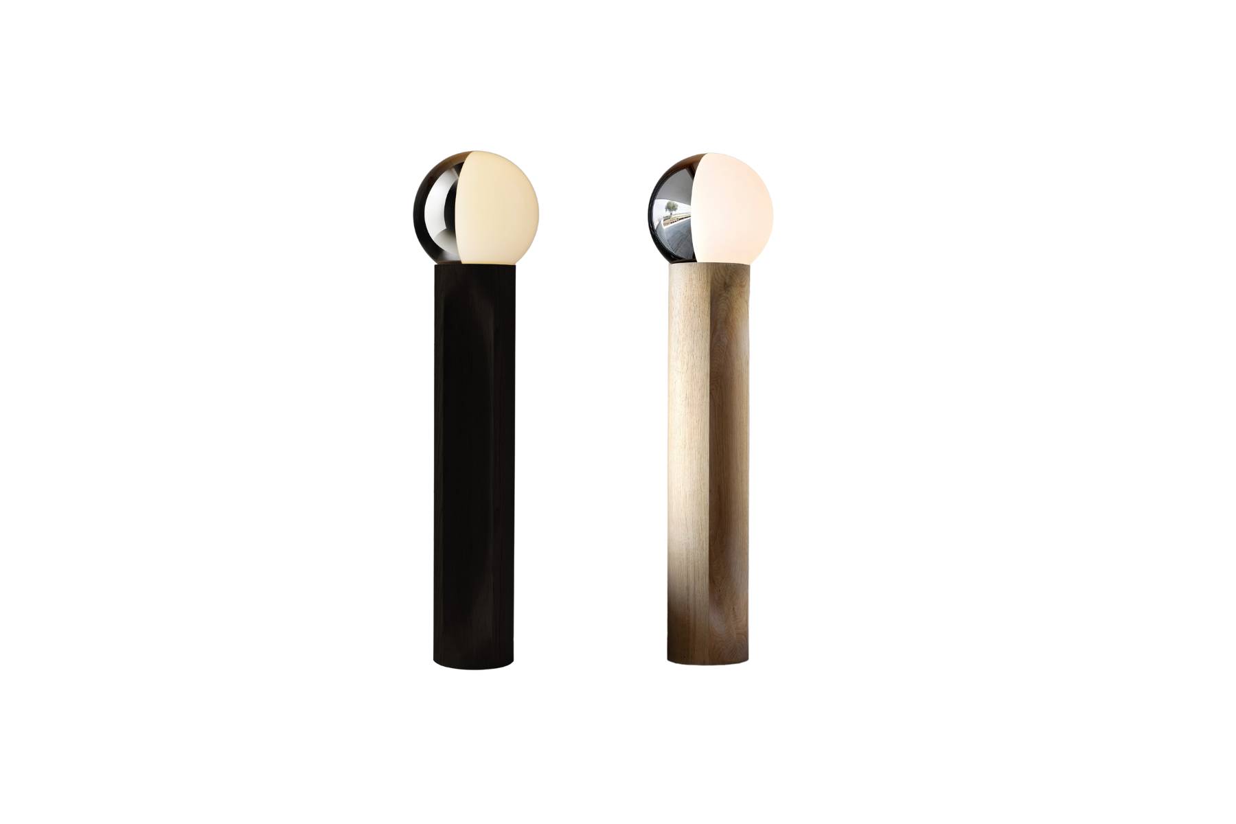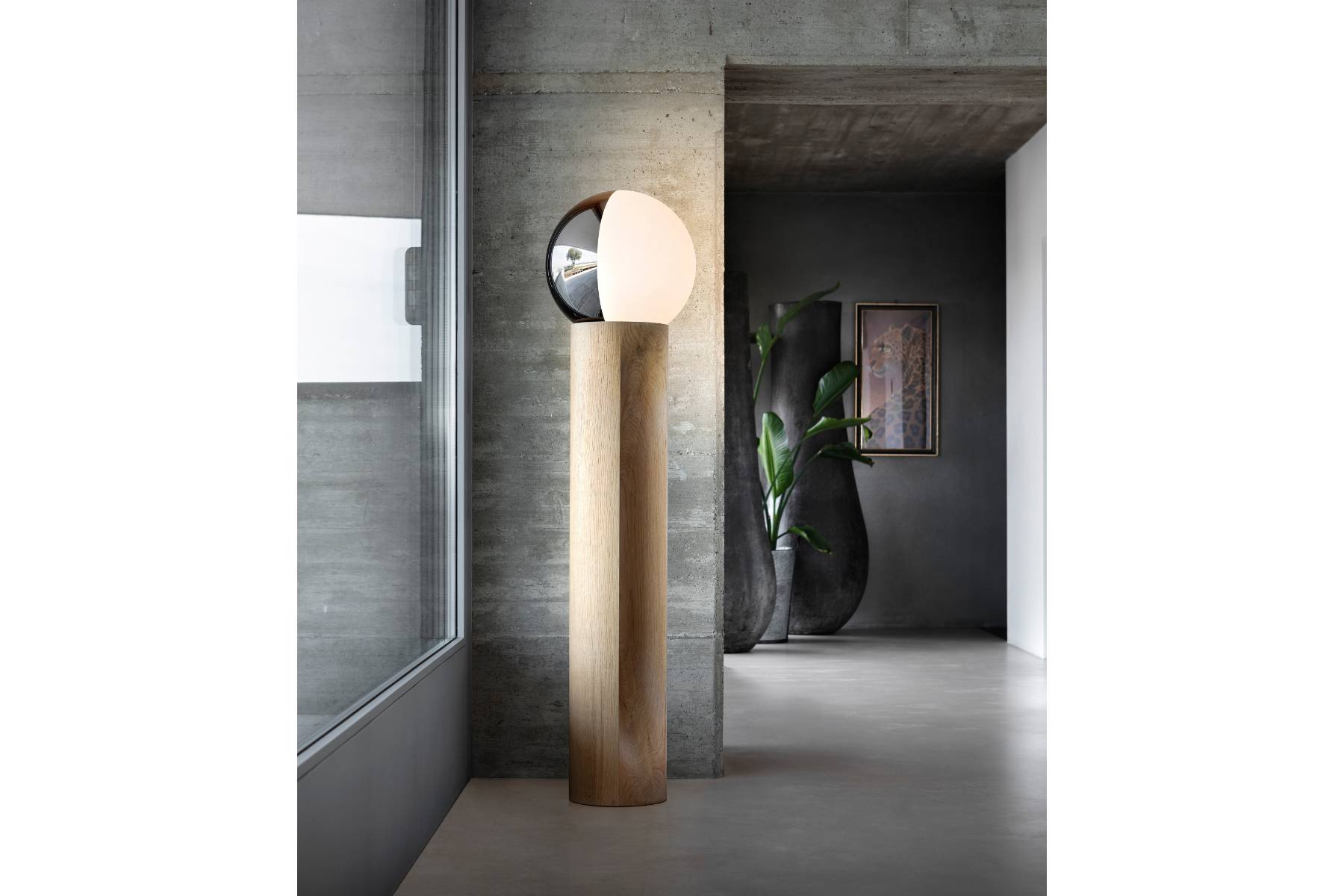 Je Suis di Pentalight è una lampada da terra con un carattere scultoreo, in quanto è composta da una sfera in vetro e argento e una base imponente in legno. Il paralume può ruotare a 360°.