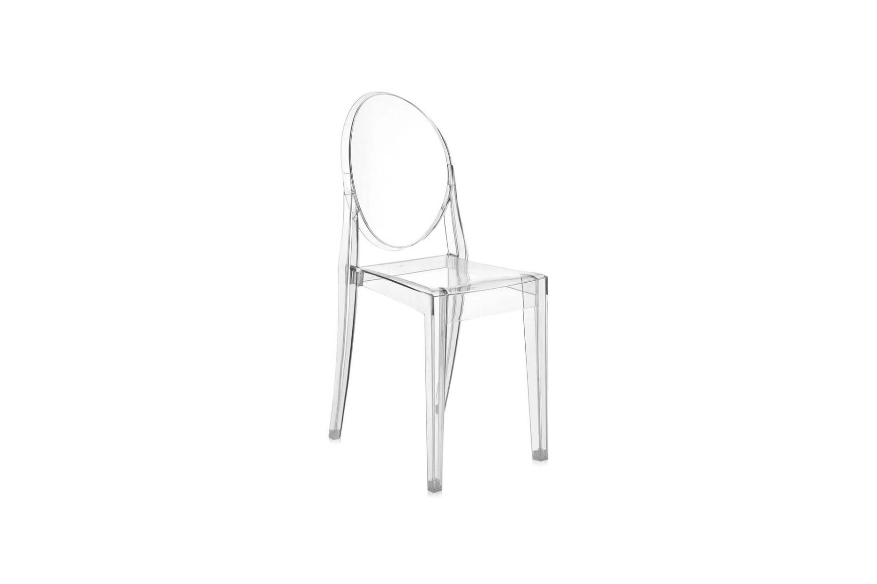 Victoria Ghost di Kartell Γ¨ una sedia con uno schienale arrotondato che richiama la forma degli antichi medaglioni, mentre la seduta Γ¨ caratterizzata da elementi lineari e geometrici.
