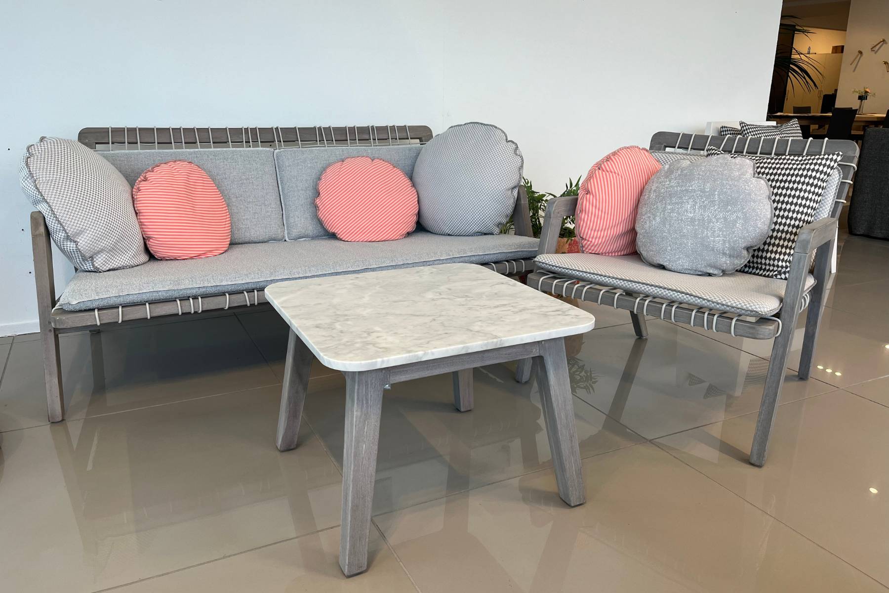 Composizione Inout di Gervasoni composta da divano, poltrona e tavolino. Il tavolino è in marmo bianco Carrara e Teak, il divano e la poltrona sono in Teak.