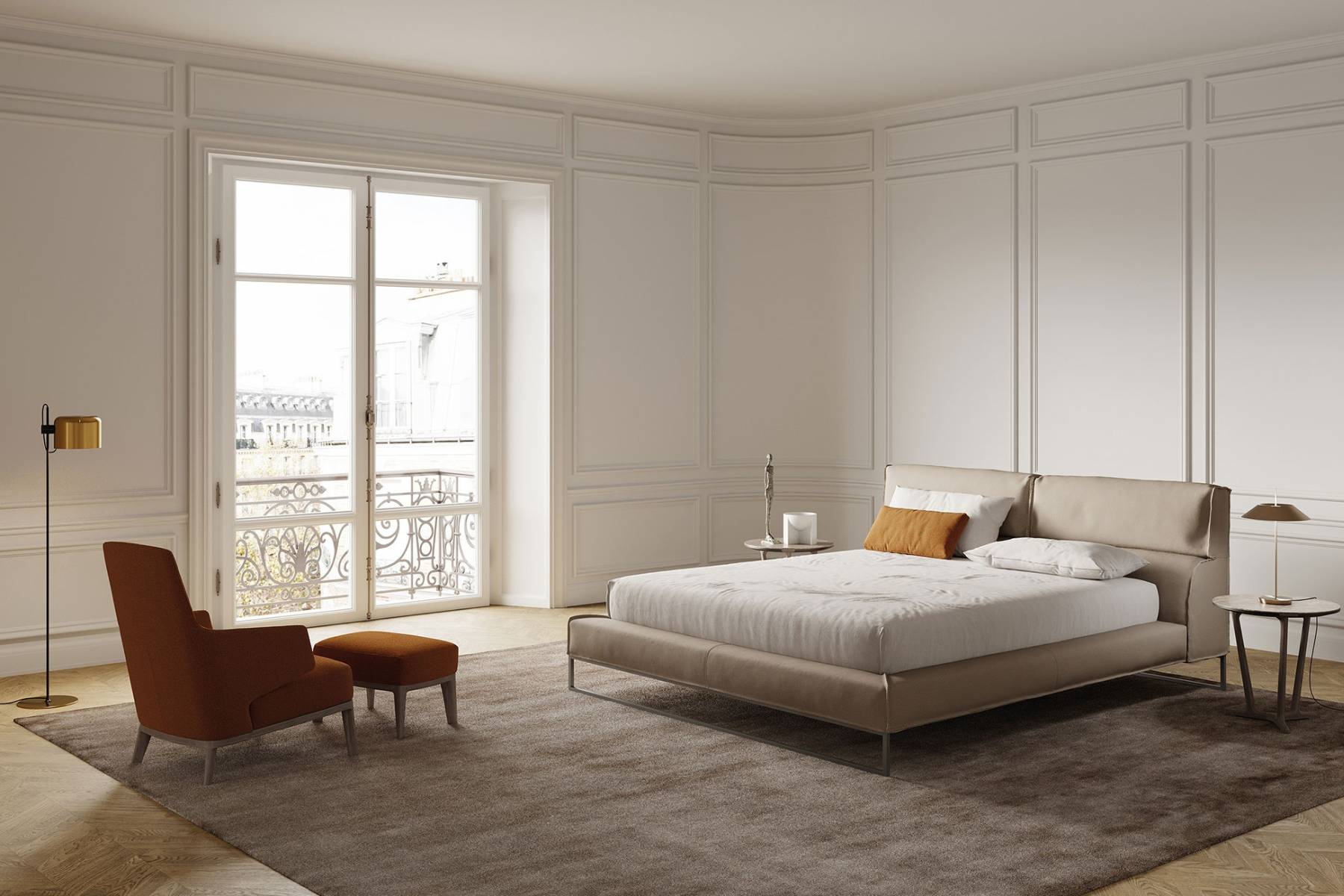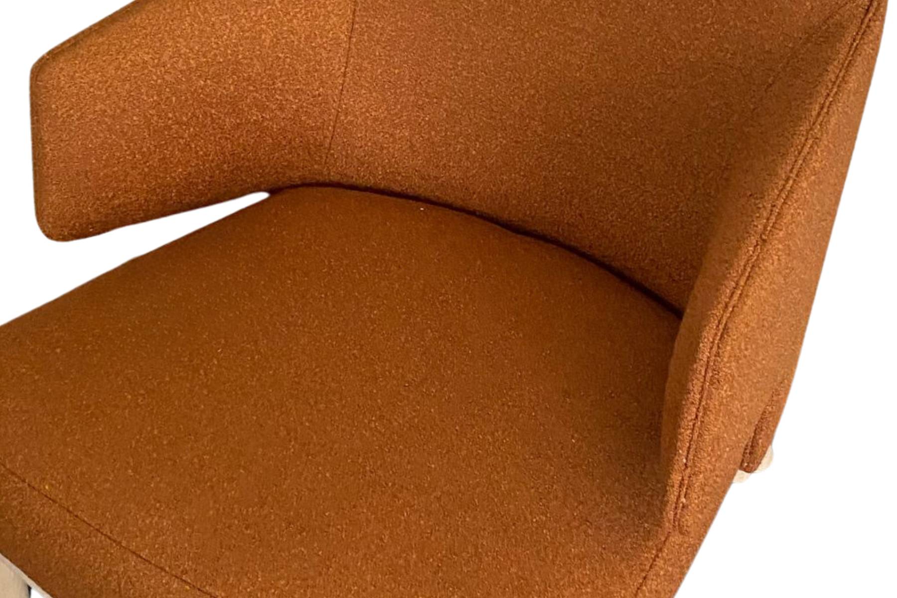 Presenta un bracciolo avvolgente sospeso che si estende senza interruzioni dalla schiena alla seduta, creando un effetto dinamico e contemporaneo.