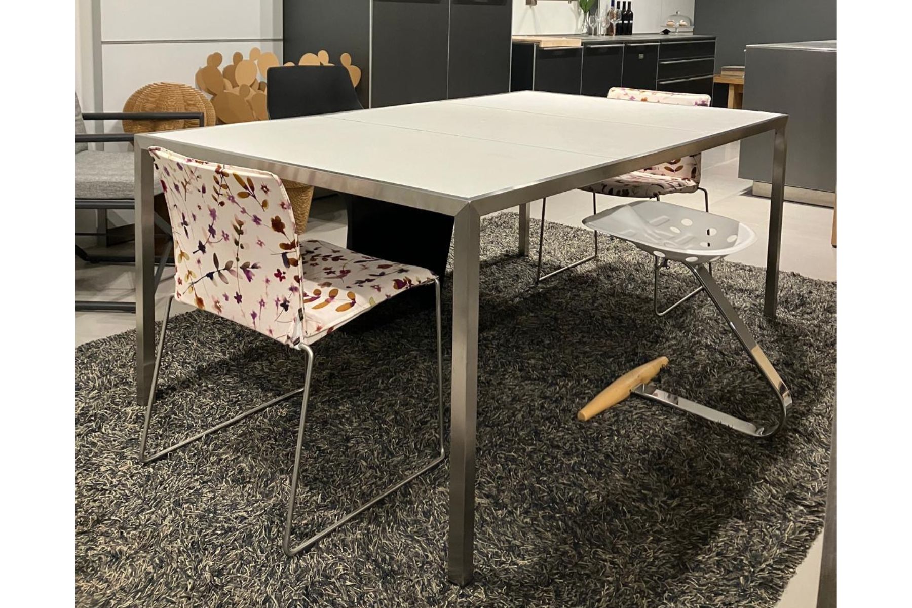 Orion di Bonacina Γ¨ un tavolo rettangolare realizzato con una struttura in acciaio Inox e il top composto da 3 lastre di ceramica bianca. Adatto anche agli ambienti esterni.