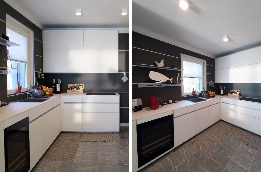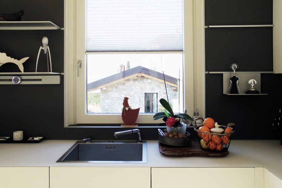 La cucina è una Valcucine Artematica in vetro laccato opaco bianco, in contrasto con la boiserie in vetro grigio scuro. Quest’ultima, oltre ad essere un elemento estetico, è anche molto importante dal punto di vista tecnico: permette di agganciare (ed eventualmente spostare) mensole, prese di corrente ed accessori, così da averli sempre a portata di mano. Si tratta sicuramente di una cucina molto spaziosa e pratica: il piano in vetro è infatti igienizzabile al 100%.