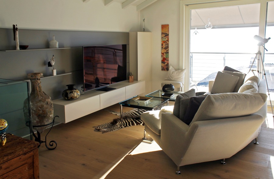Sulla parete principale abbiamo progettato un mobile Modulnova Blade, perfetto come porta TV, ma anche per conservare nei pensili documenti o altri accessori. La composizione è studiata con una boiserie, che permette di creare uno sfondo sul quale poi agganciare i volumi dei pensili e delle mensole.