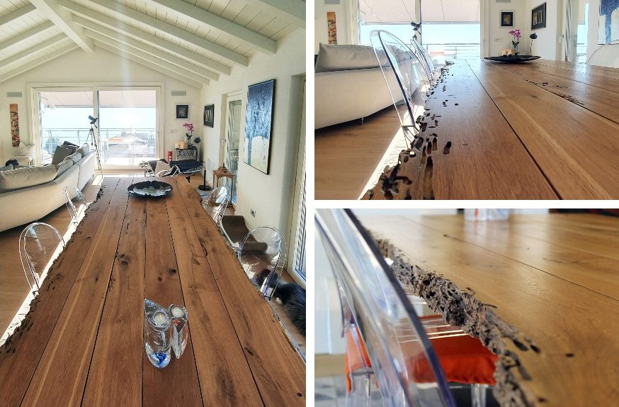 Il tavolo Natura Briccola di Riva 1920 è il punto focale della stanza, messo in evidenza dalle sedie Louis Ghost di Kartell, che lo completano senza appesantirlo. Si tratta di un pezzo unico, creato con le briccole riciclate della Laguna di Venezia, abbinate a dei supporti in metallo: è un tavolo senza tempo, perfetto per chi apprezza il legno grezzo e le superfici materiche.